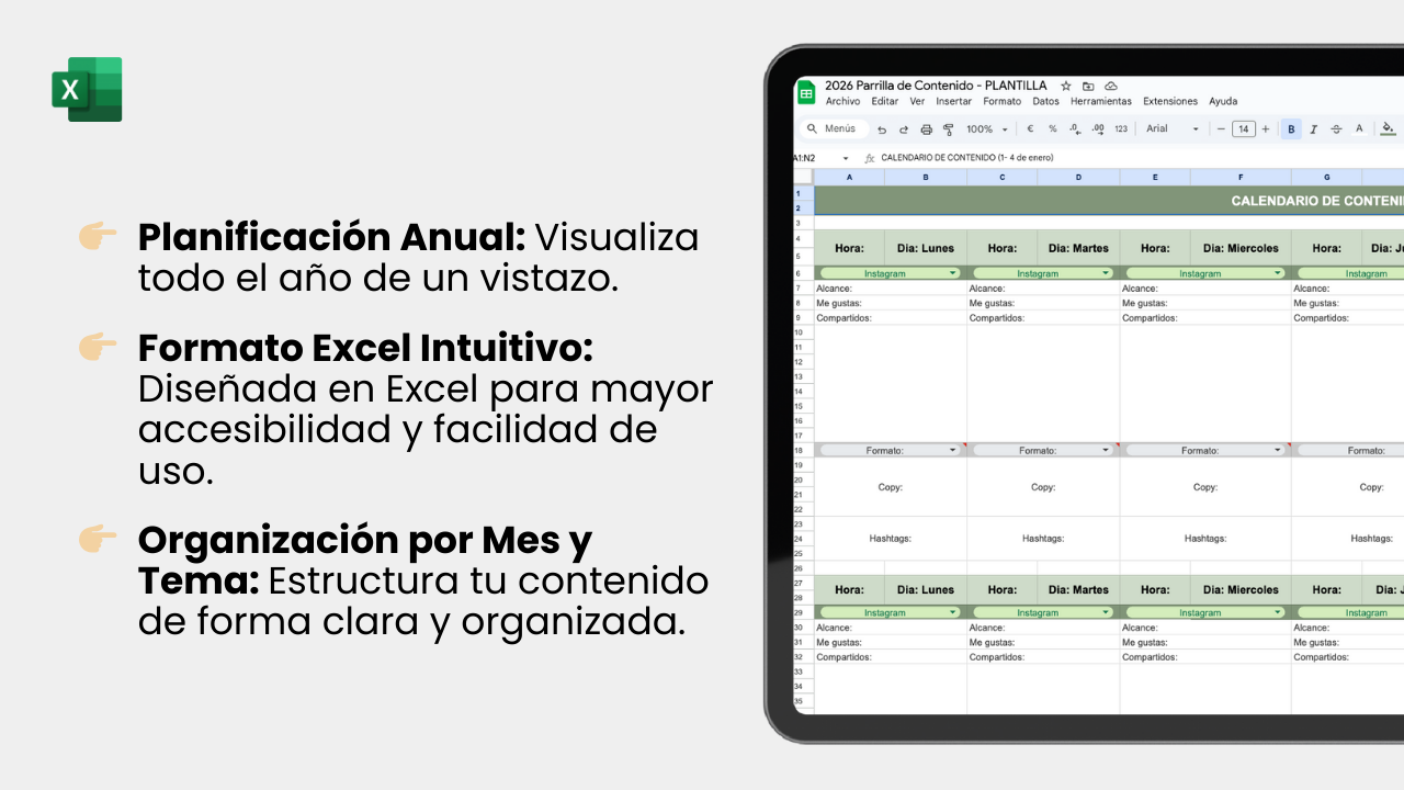 - Formato Excel Intuitivo:Diseñada en Excel para mayor accesibilidad y facilidad de uso. Personaliza fechas, temas y tipos de contenido de manera sencilla. No necesitas ser un experto en hojas de cálculo para aprovechar al máximo esta herramienta.